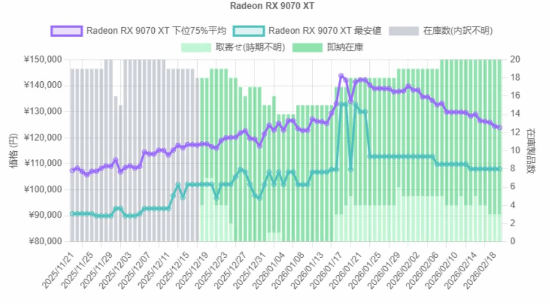 数据闪现,RX 9070 XT面前最低售价约为108,000日元(约 770 好意思元),此前曾一度冲破130,000日元(约 840 好意思元)。平均售价也从144,000日元渐渐降至130,000日元。
