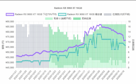 另一款热点型号——Radeon RX 9060 XT 16GB——相似出现较着回调,当今价钱约为 71,000 日元(约 458 好意思元),此前峰值曾达到 87,000 日元(约 562 好意思元)。